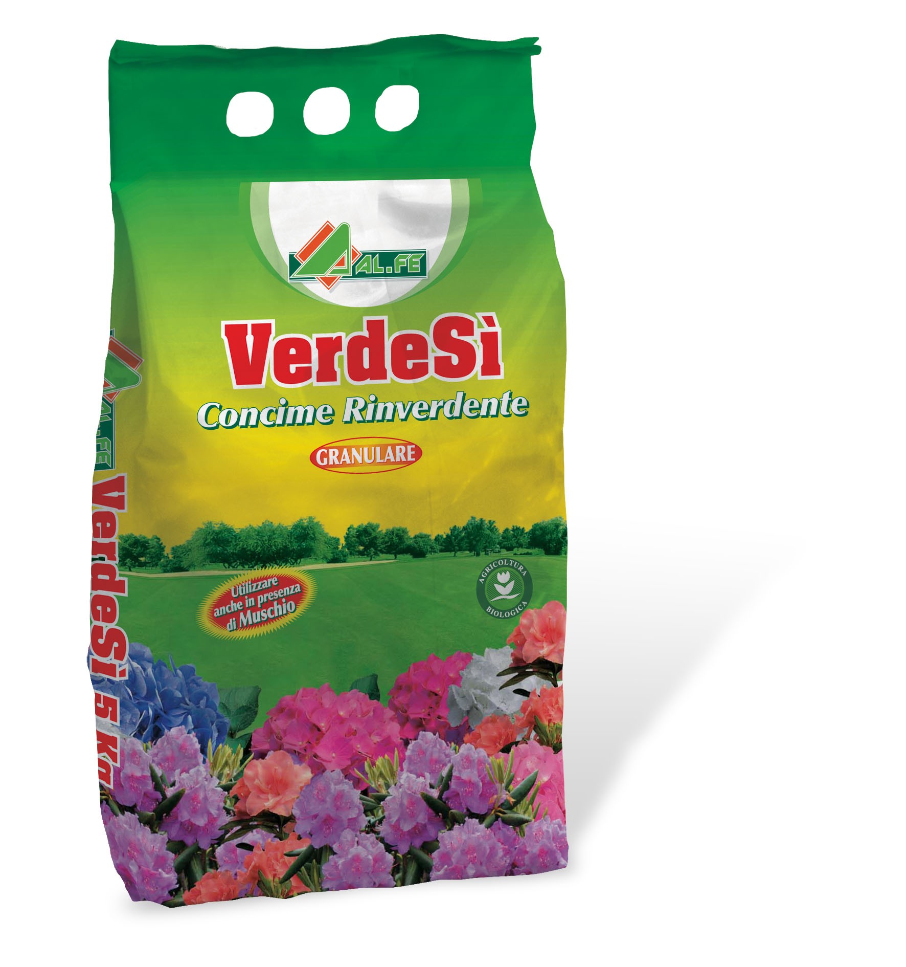 VERDESI’ è un concime granulare consentito in agricoltura biologica a base di solfato di ferro. La particolare composizione chimica di VERDESI’ lo rende un concime ad azione nutriente, rinverdente ed antimuschio. Oltre al ferro, che contrasta tutte le forme di clorosi ferrica, causa di ingiallimenti fogliari e caduta delle foglie in piante ornamentali, orticole e tappeti erbosi, VERDESI’ contiene anche il magnesio, importante elemento fertilizzante che assicura il mantenimento di un verde brillante in tutti i tappeti erbosi. Grazie alla forte azione rinverdente VERDESI’ è particolarmente indicato per la concimazione di tappeti erbosi, nei quali previene e contrasta l’insorgenza di muschio. Indicato anche per le piante acidofile (azalee, rododendri, ecc.)